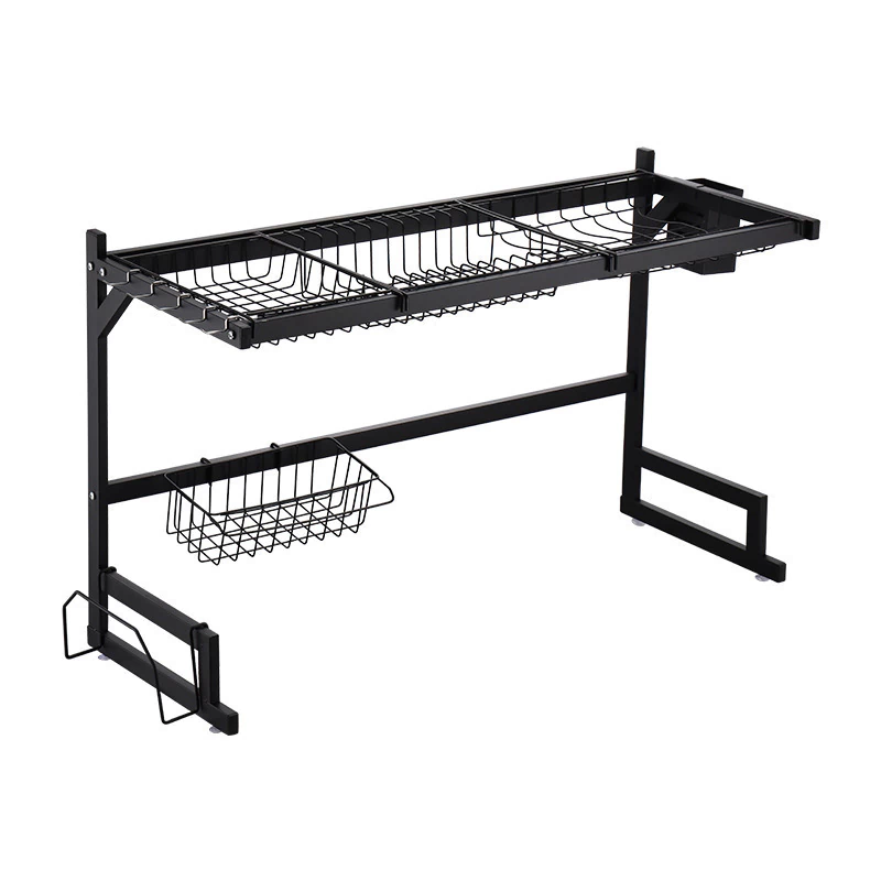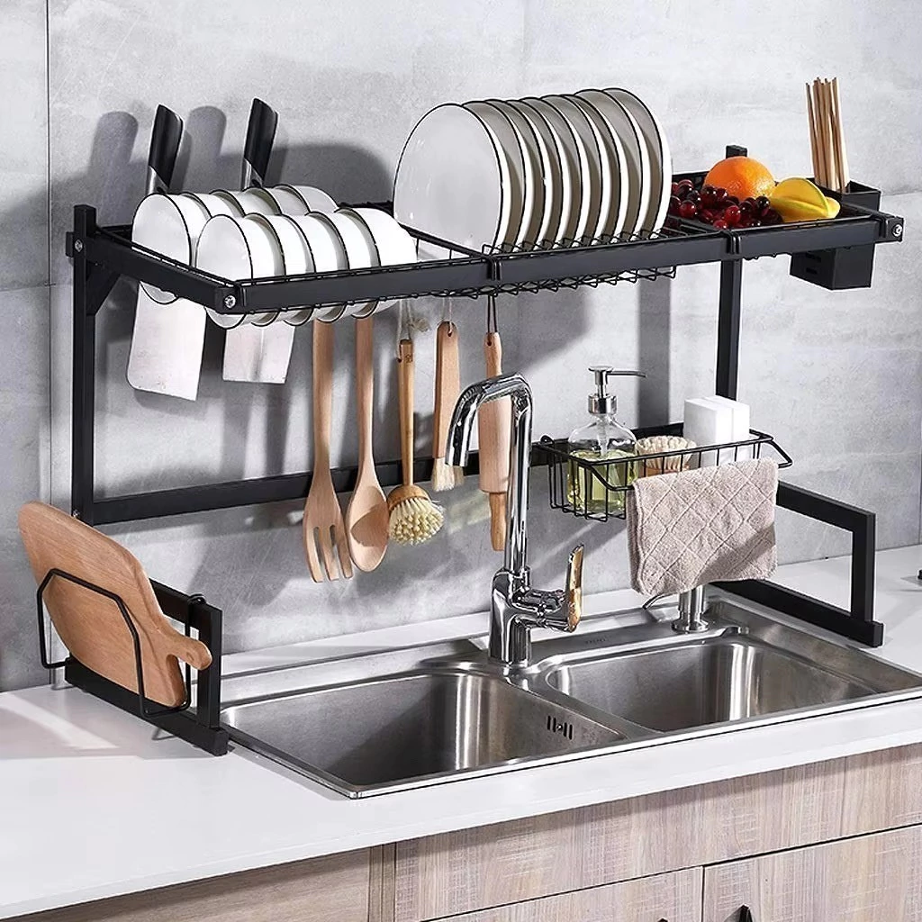 Este secaplatos está fabricado en aluminio resistente, lo que asegura durabilidad y facilidad de limpieza. Su estructura permite un secado rápido y eficiente de vajilla, vasos y cubiertos, evitando la acumulación de humedad. Además, incluye soportes colgantes y ganchos que facilitan la organización de utensillos, manteniendo todo ordenado y al alcance.